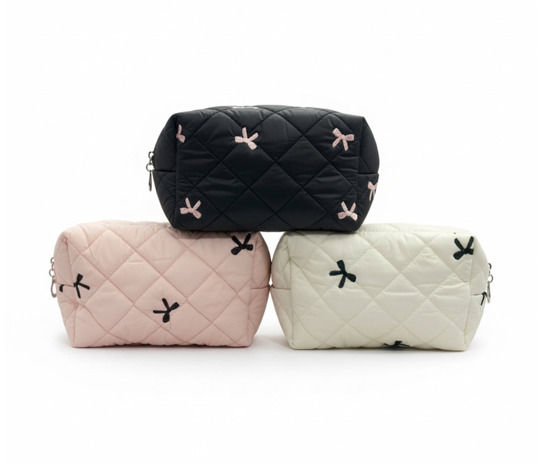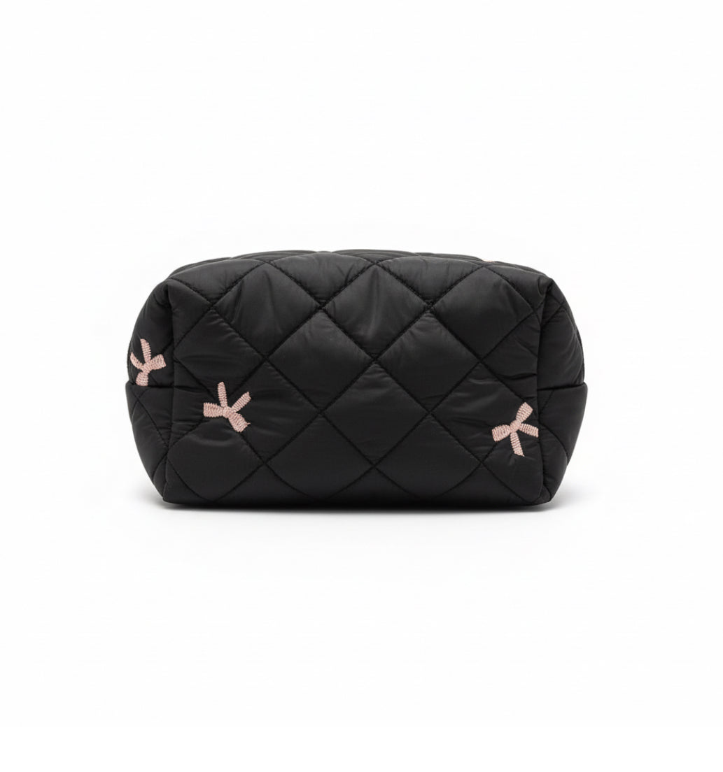 Neceser suave y acolchado con diseño de rombos y lazos bordados. Disponible en negro, rosa y crema. Amplio y ligero, perfecto para organizar tus esenciales con un toque chic.